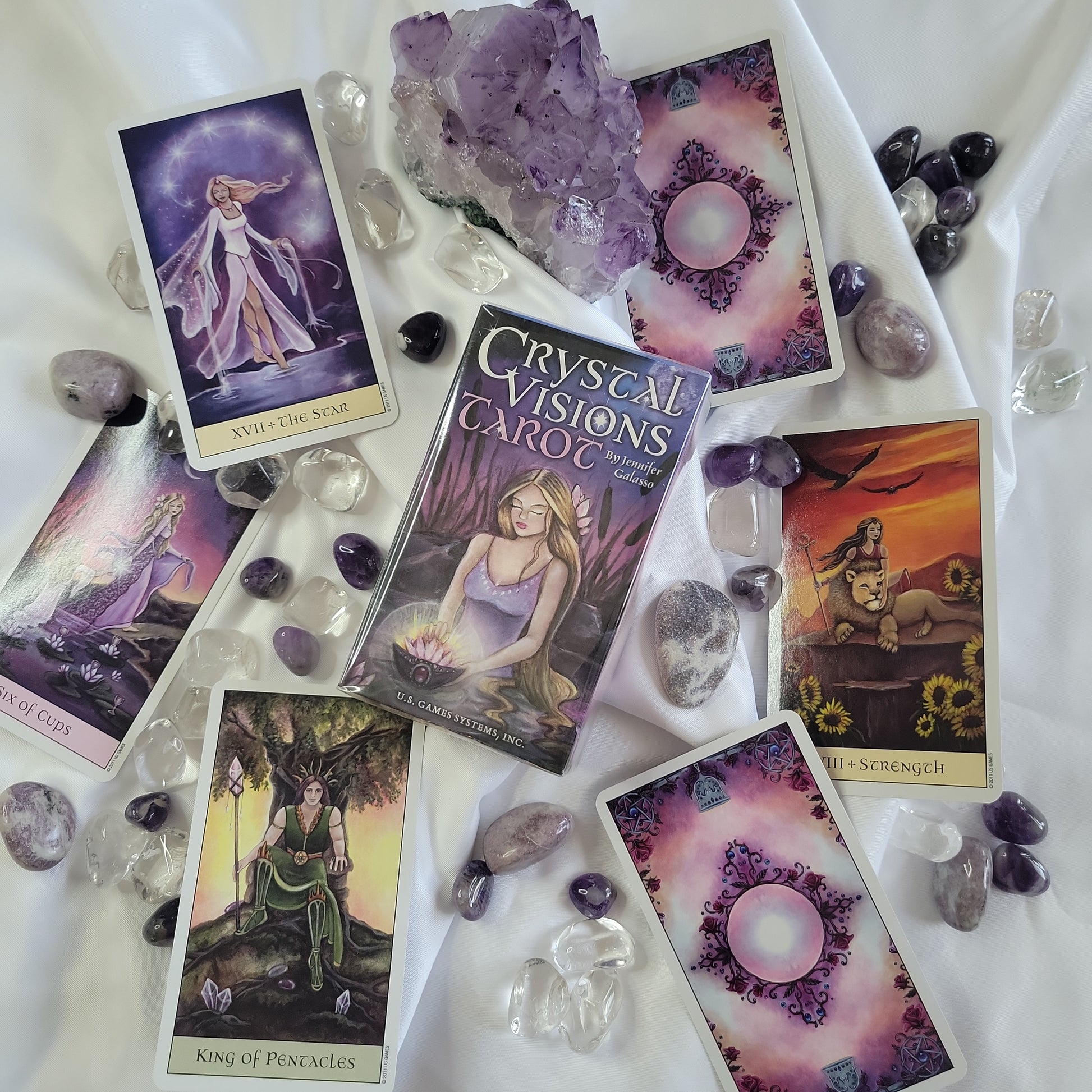 Crystal Visions Tarot remains true to the classic Rider-Waite 78-card system in much of its symbolism, as well as in card and suit names.