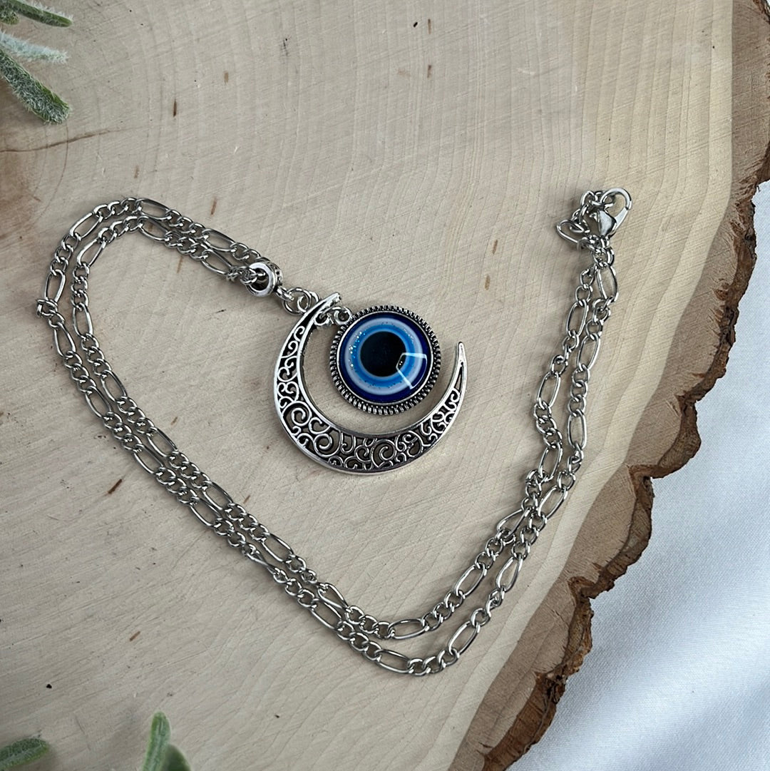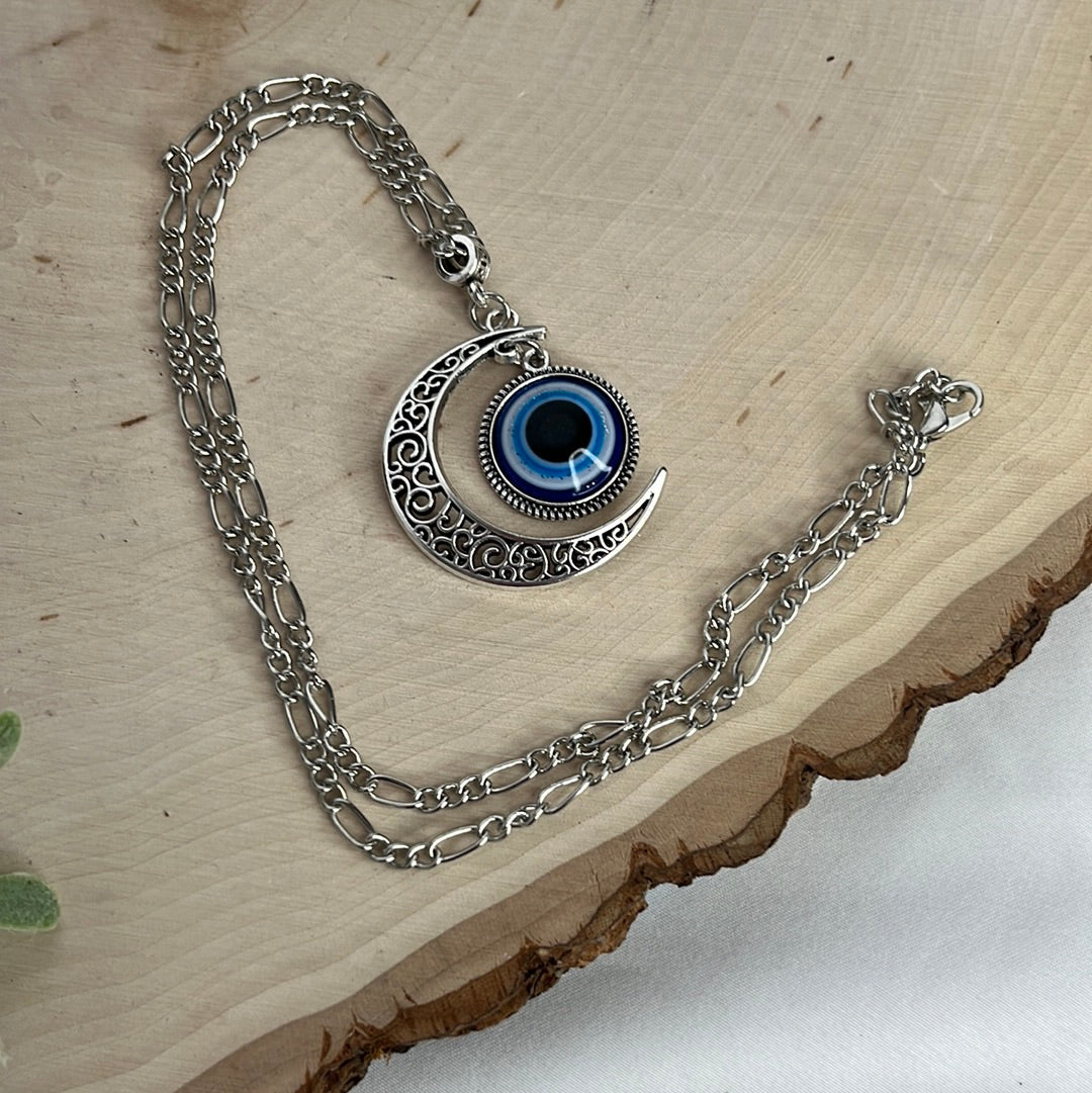 Keep negative energy at bay with our stunning Evil Eye with Crescent Moon Necklace. This captivating piece features a glowing crescent moon charm nestled alongside a mesmerizing Evil Eye pendant, symbolizing protection and guidance. Crafted from high-quality materials, this necklace is sure to turn heads and bring a touch of mystique to any outfit. Perfect for those seeking a unique and meaningful accessory, this Evil Eye with Crescent Moon Necklace is a must-have addition to your jewelry collection. Wear it as a powerful talisman or gift it to a loved one to offer them protection and positivity wherever they go. Shop now and add a touch of magic to your everyday life with this exquisite necklace